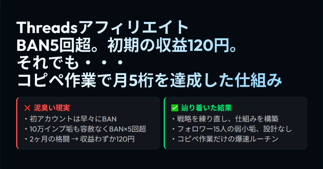 前回記事「Threadsアフィリで美容ジャンルは危険?薬機法の落とし穴と2ヶ月で挫けた実録」の続編です。美容ジャンルで2ヶ月120円・3回BANを食らった私が、その後どうやって月5桁に到達したのか。今回はその「仕組み化」の話です。引き続き、FXネタではないのです~