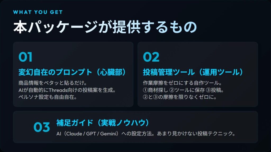 - 変幻自在のプロンプト(心臓部):商材情報を貼り付けるだけでThreads投稿案を生成する指示書。薬機法・景表法を意識した設計